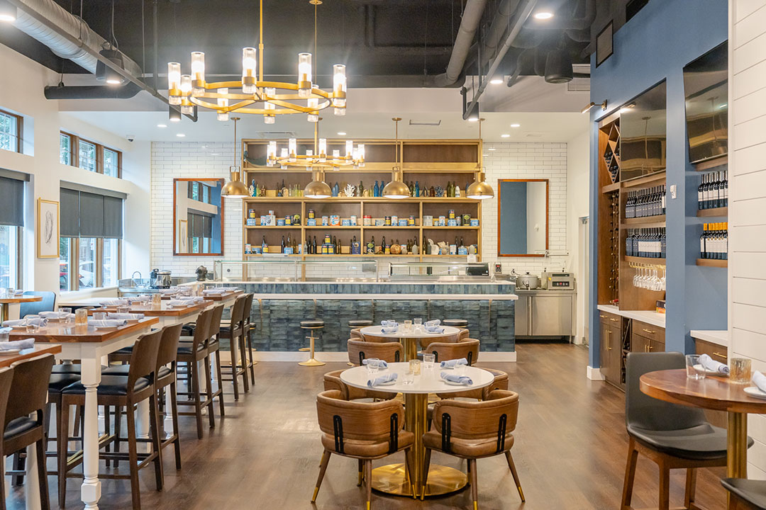 Unique and casual seating within the main dining room of the West Chester Seafood Kitchen. This space is perfect for a casual happy hour with your corporate team, friends, or family.